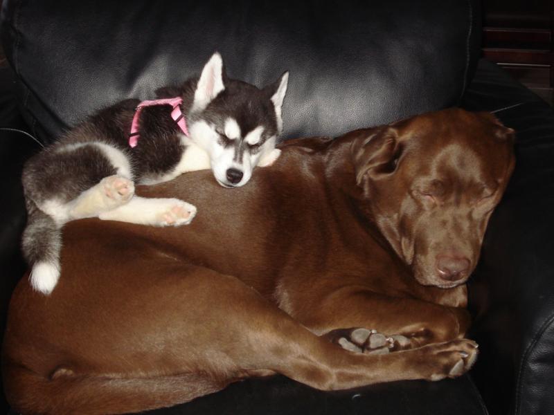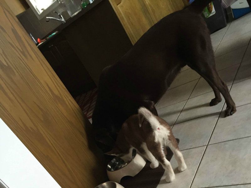 I thought I'd provide a quick update on Gaïa: she is doing fantastic (and growing like a little weed)! She seemed quite comfortable from the get go, and ate and drank with gusto from the moment we got home. She's definitely not shy, that's for sure! Our older pups have taken to her very well. It took a little longer with Luna (6-yr-old female) than with Apollo (4-yr-old male), but everyone is now good friends.