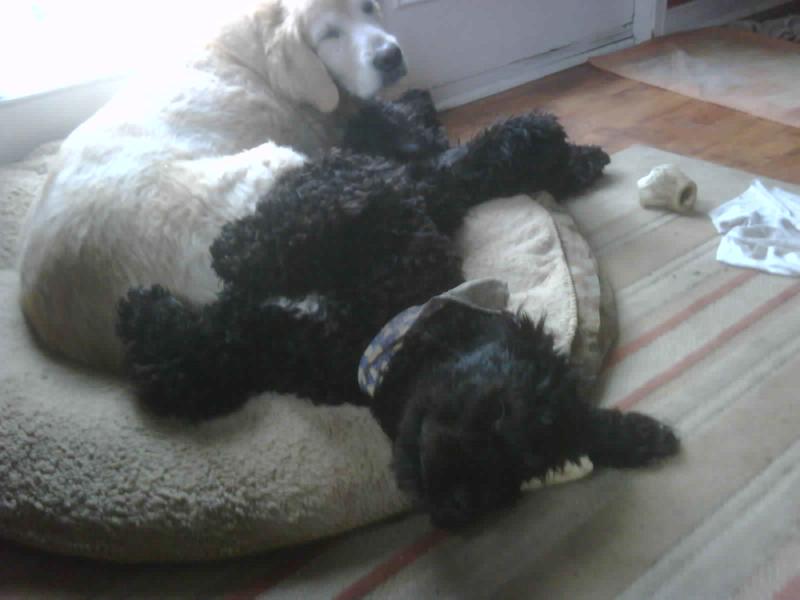Here's a pic of the boys in the pond, which they love. (I think Ambroise has been wet all summer - he must think he's  one of your Portuguese Water Dogs :) Also is a pic of the boys in the car, coming back from a walk.
